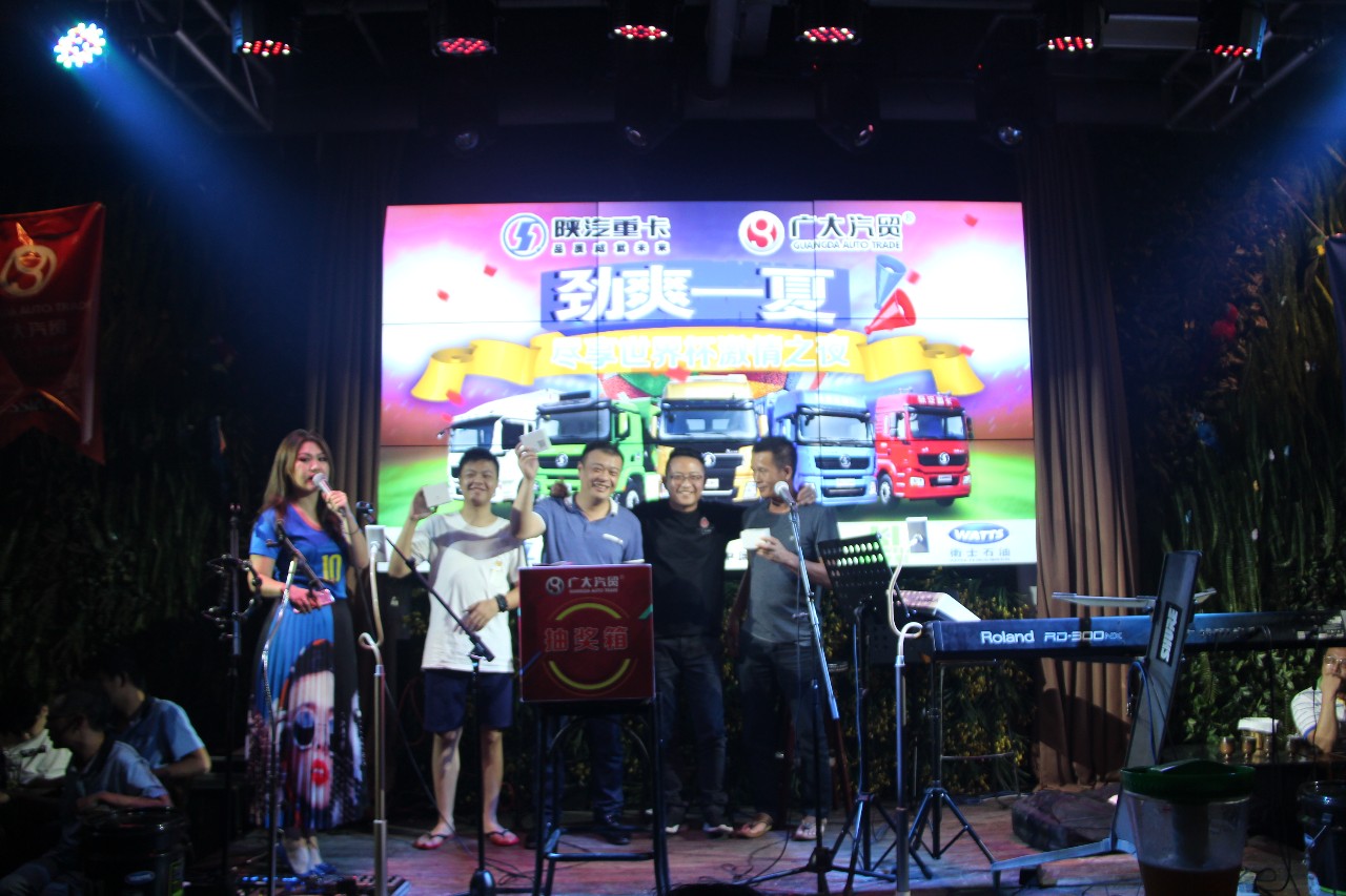 伴隨著巴西對戰(zhàn)哥斯達(dá)黎加精彩賽事的打響,現(xiàn)場頓時響起一片歡呼聲。讓我們一起走進(jìn)活動現(xiàn)場!主持人為大家介紹到場的嘉賓, 汕頭市物流行業(yè)協(xié)會秘書長韓曉東先生;陜重汽廣州辦事處主任鄭輝先生;陜重汽廣州廣州辦事處服務(wù)經(jīng)理王曉飛先生;陜重汽廣州辦事處綜合經(jīng)理李創(chuàng)科先生;陜重汽廣州辦事處金融經(jīng)理馬剛剛先生;廣東廣大汽車貿(mào)易有限公司總經(jīng)理杜文遠(yuǎn)先生;廣東廣大汽車貿(mào)易有限公司銷售總監(jiān)朱振明先生;中國人民財(cái)產(chǎn)保險股份有限公司汕頭分公司總經(jīng)理王毅先生;汕頭市百爵行汽車貿(mào)易有限公司總經(jīng)理鄭靜勇先生;廣東衛(wèi)士石化有限公司總經(jīng)理梁湛先生;廣東康威交通科技有限公司總經(jīng)理彭少彪先生等盛邀出席!